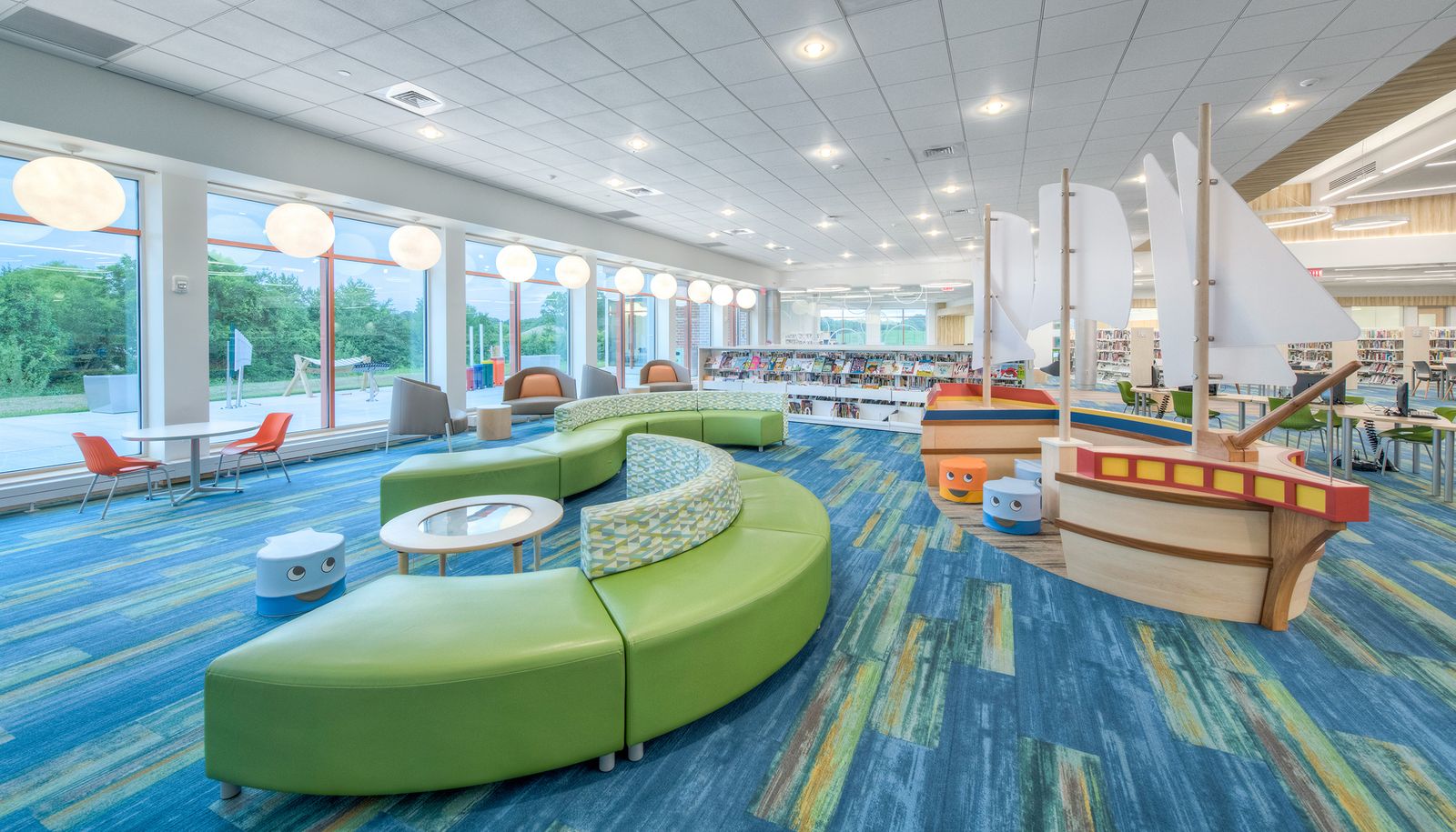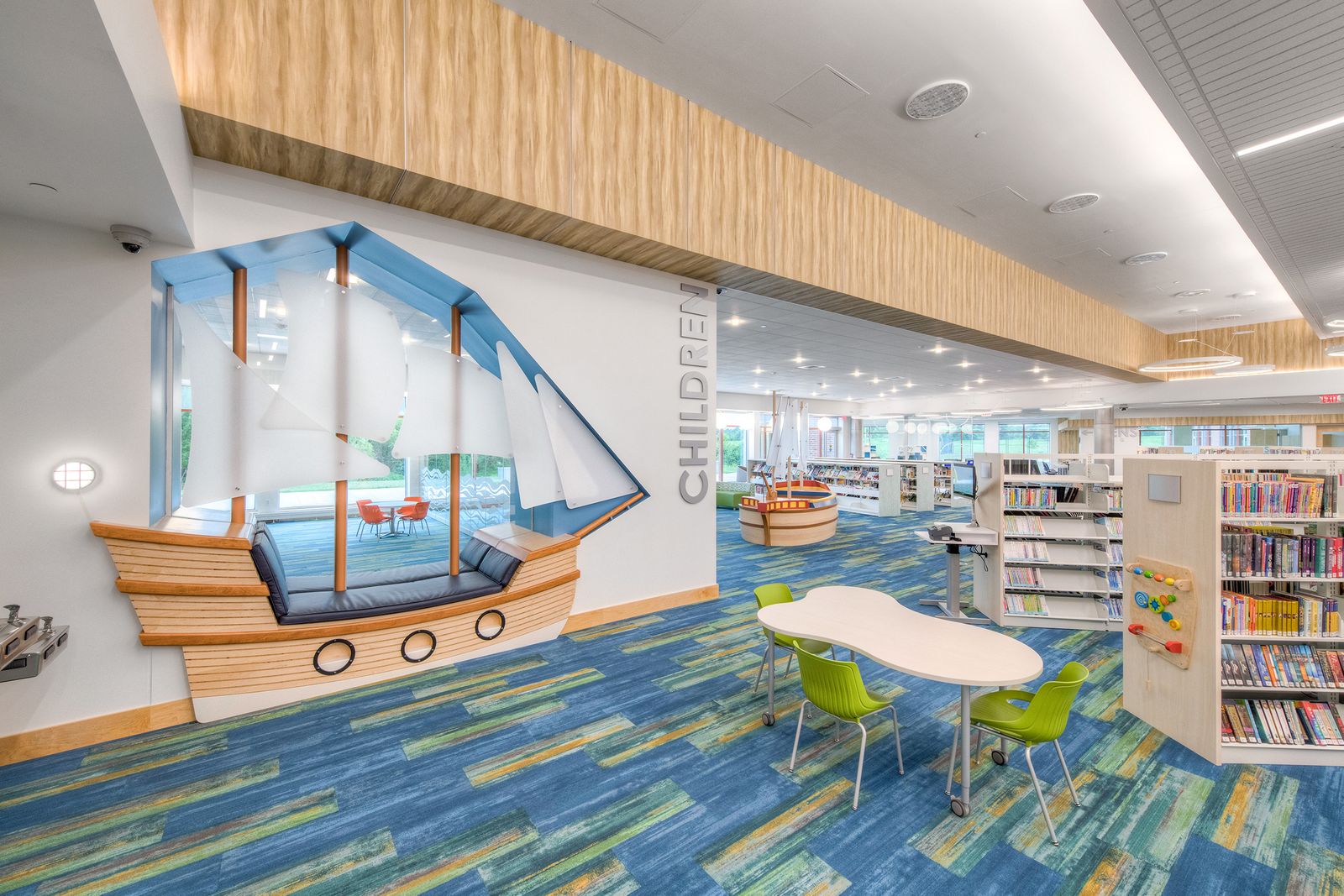 The naturally-daylit teen area looks out onto a field and the forest beyond, inspiring a sustainable future. The children’s reading areas are defined by seating in the form of two ships that representing the merchant ships called the Ark and the Dove that started the Maryland colony in 1630. These ships help to remind visitors and teach children the unique history of Leonardtown and St. Mary’s County.