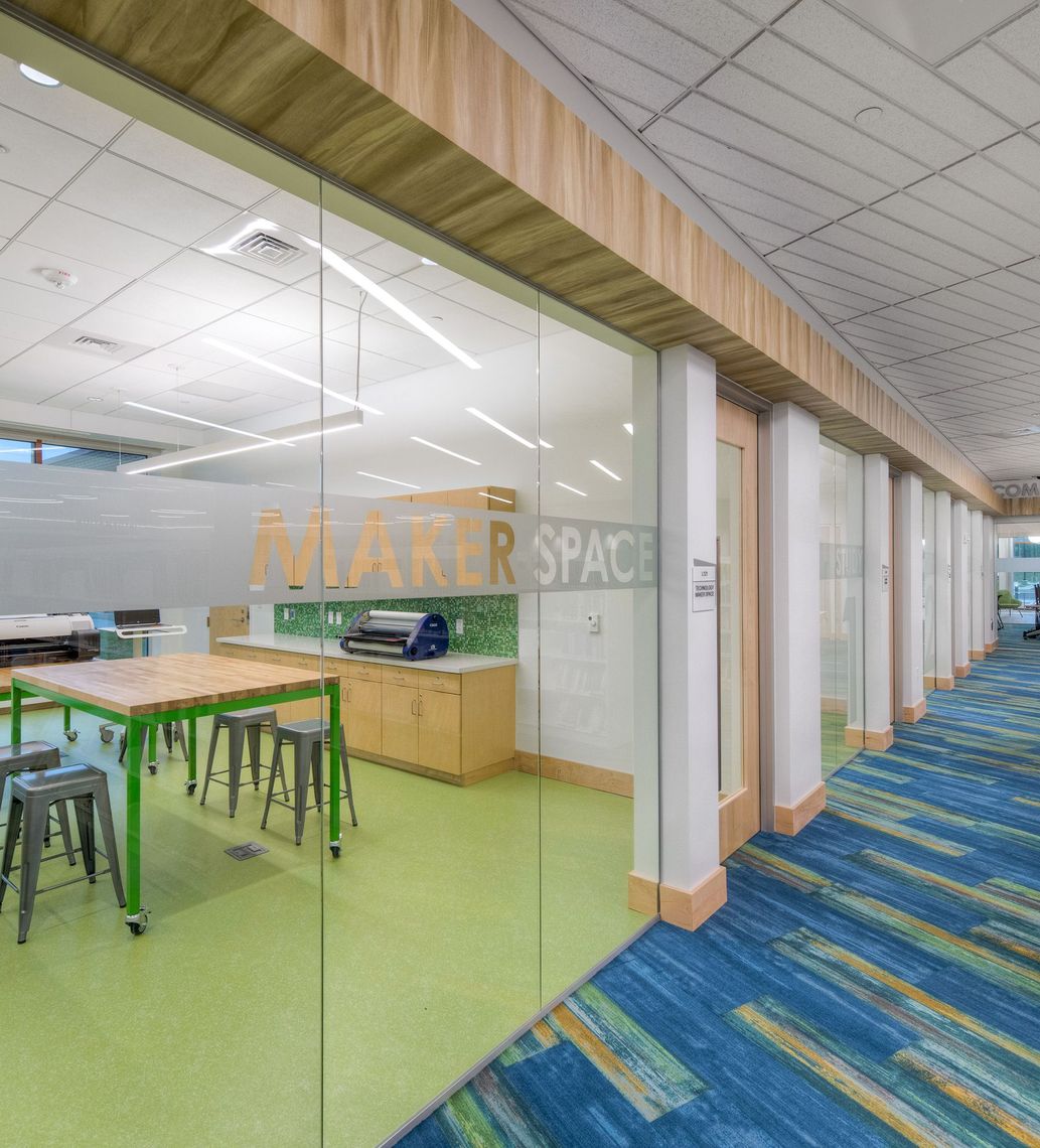 From messy to clean, or noisy to quiet, rooms in a library need to hold many functions throughout the day. Modular, multi-height tables on casters, movable furniture and durable flooring accommodate reconfiguration of rooms and spaces with minimal effort.