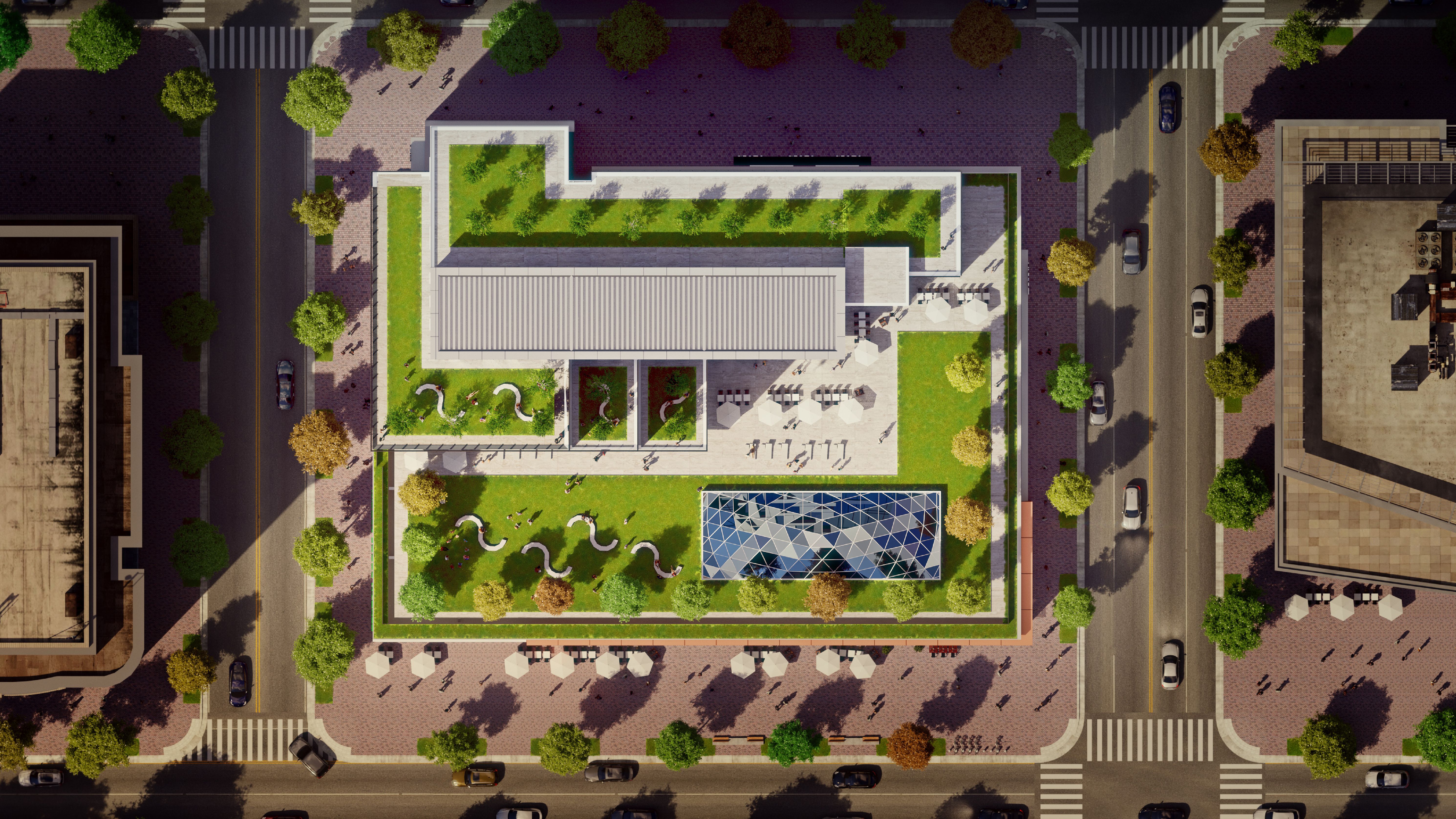 The cascading garden terraces were influenced by the Babylonian hanging gardens, providing outdoor living at different levels. This building is envisioned as a hub of activity day-to-night: retail, healthcare, office, and homes.